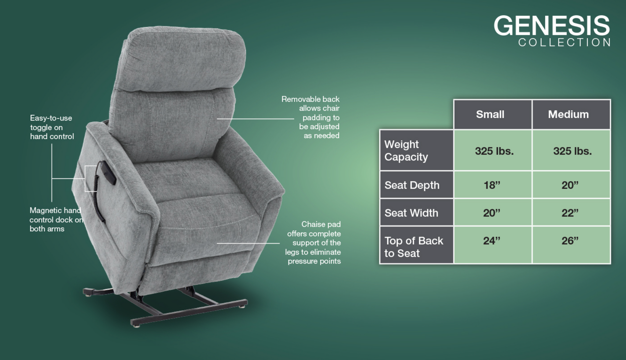 • Small – 325 lb. weight capacity – 20” seat width – 5’3” and below recommended